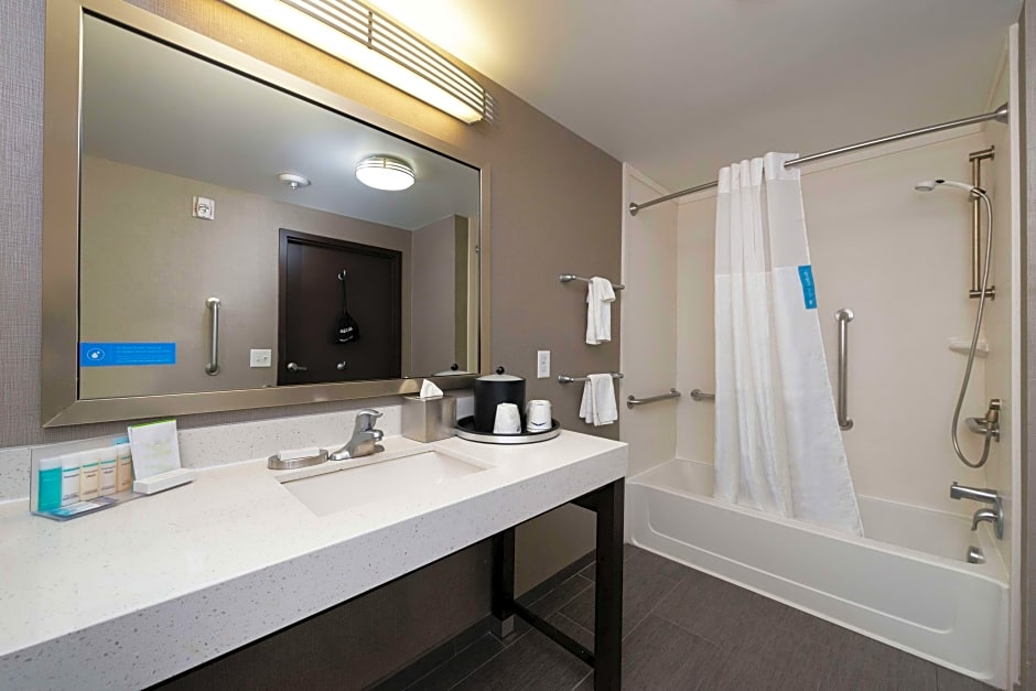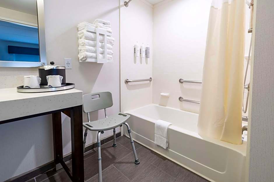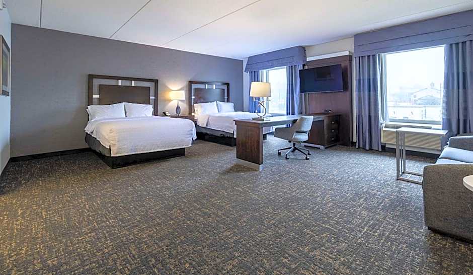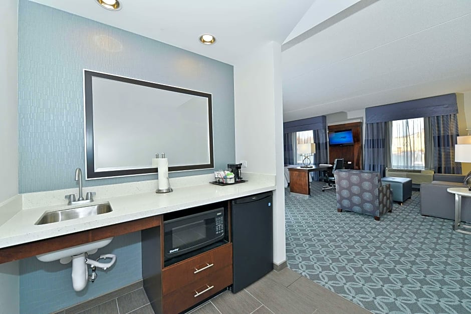 This suite features a separate seating area with a sofa bed and desk. A wetbar with a microwave and small refrigerator are provided.
